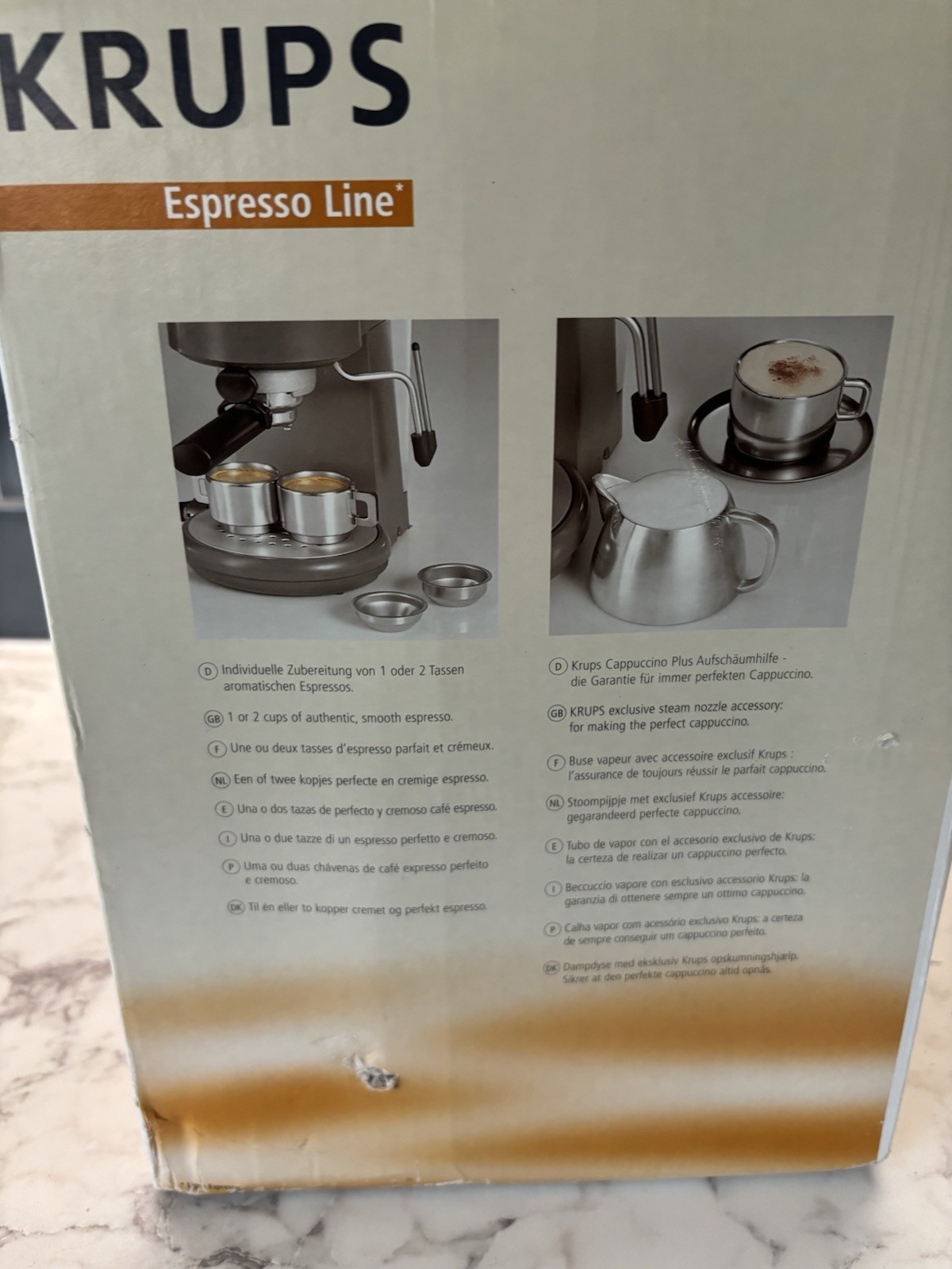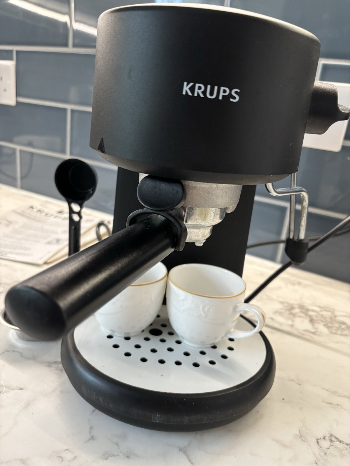 Krups 2 cup espresso coffee machine with 15 bars high pump pressure. Seldom used. In original box with user manual. Frother does not work well but great for espresso coffee. Cups are for illustration only and not included.