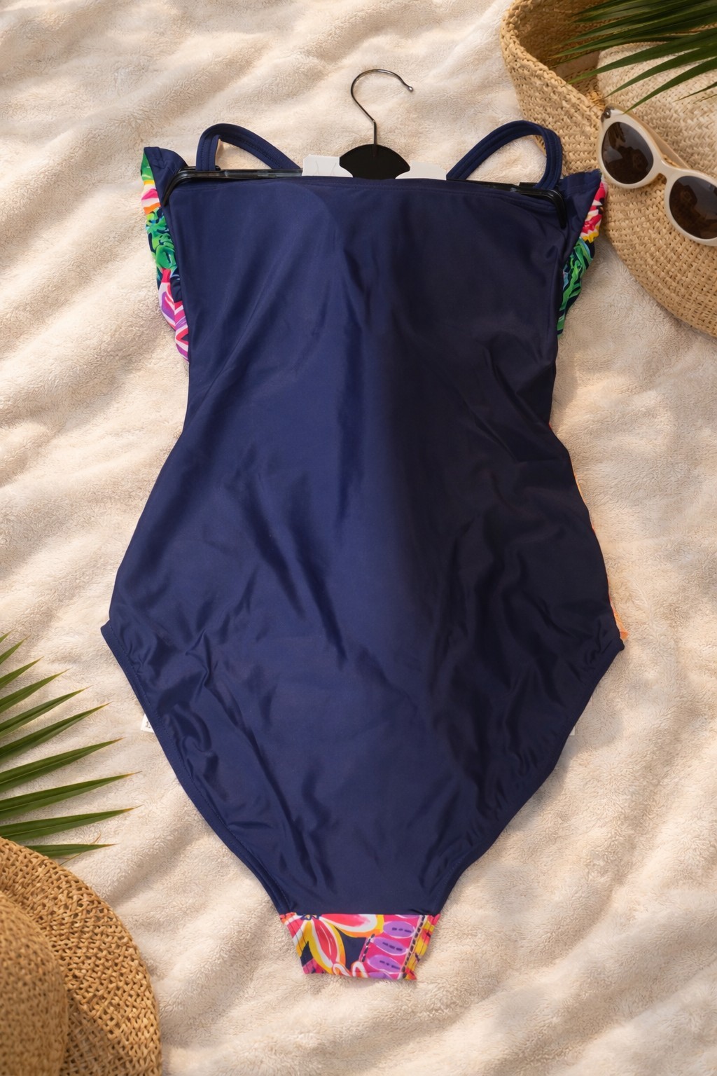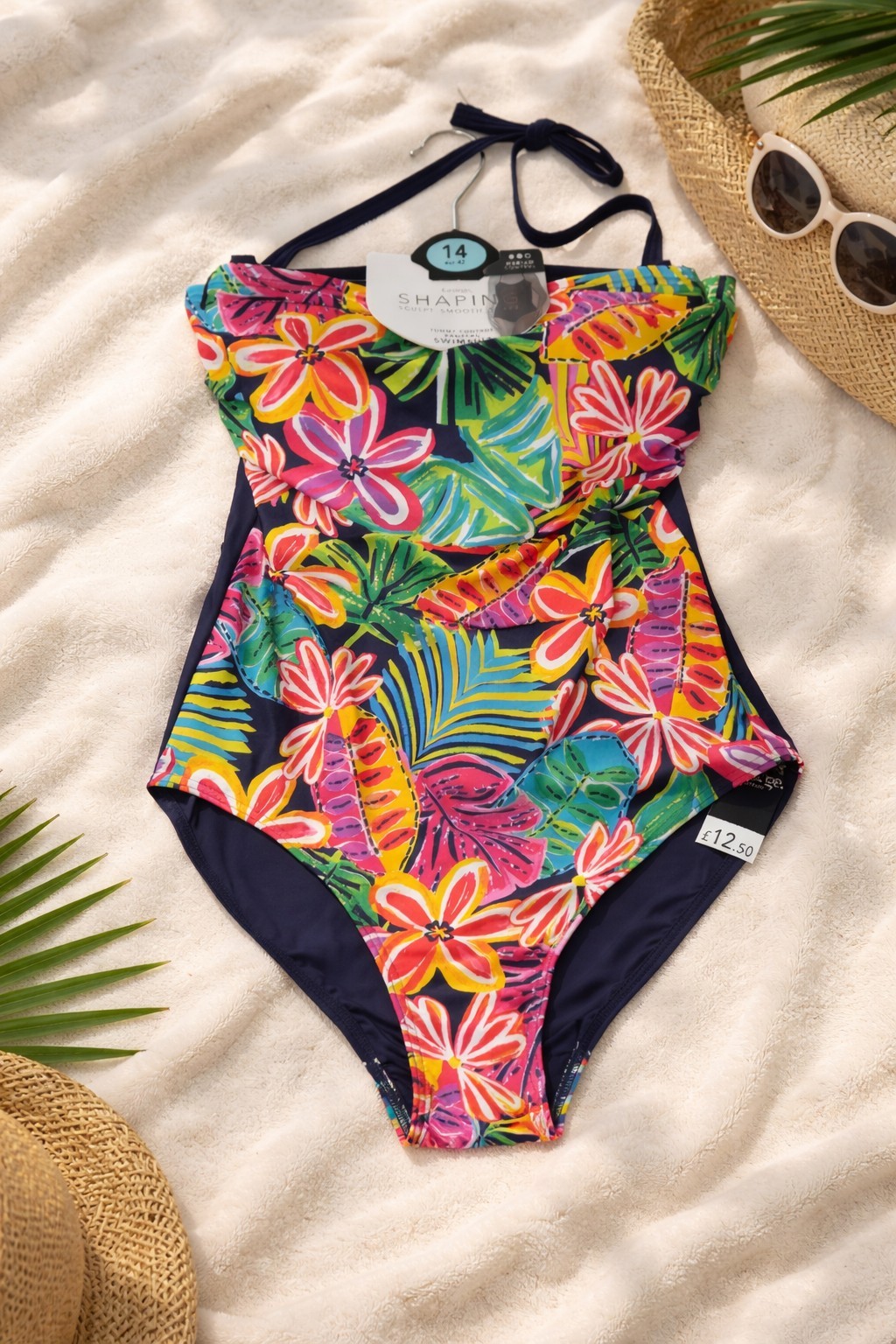 Beautiful M&S shaping swimsuit in size 14, brand new with tags. Features a flattering navy base with vibrant tropical floral print and a wrap-style front for a slimming effect. Designed with tummy control and shaping fabric to smooth and sculpt. Adjustable halterneck ties for a comfortable, supportive fit. Perfect for holidays, spa days or swimming. New with tags – never worn.