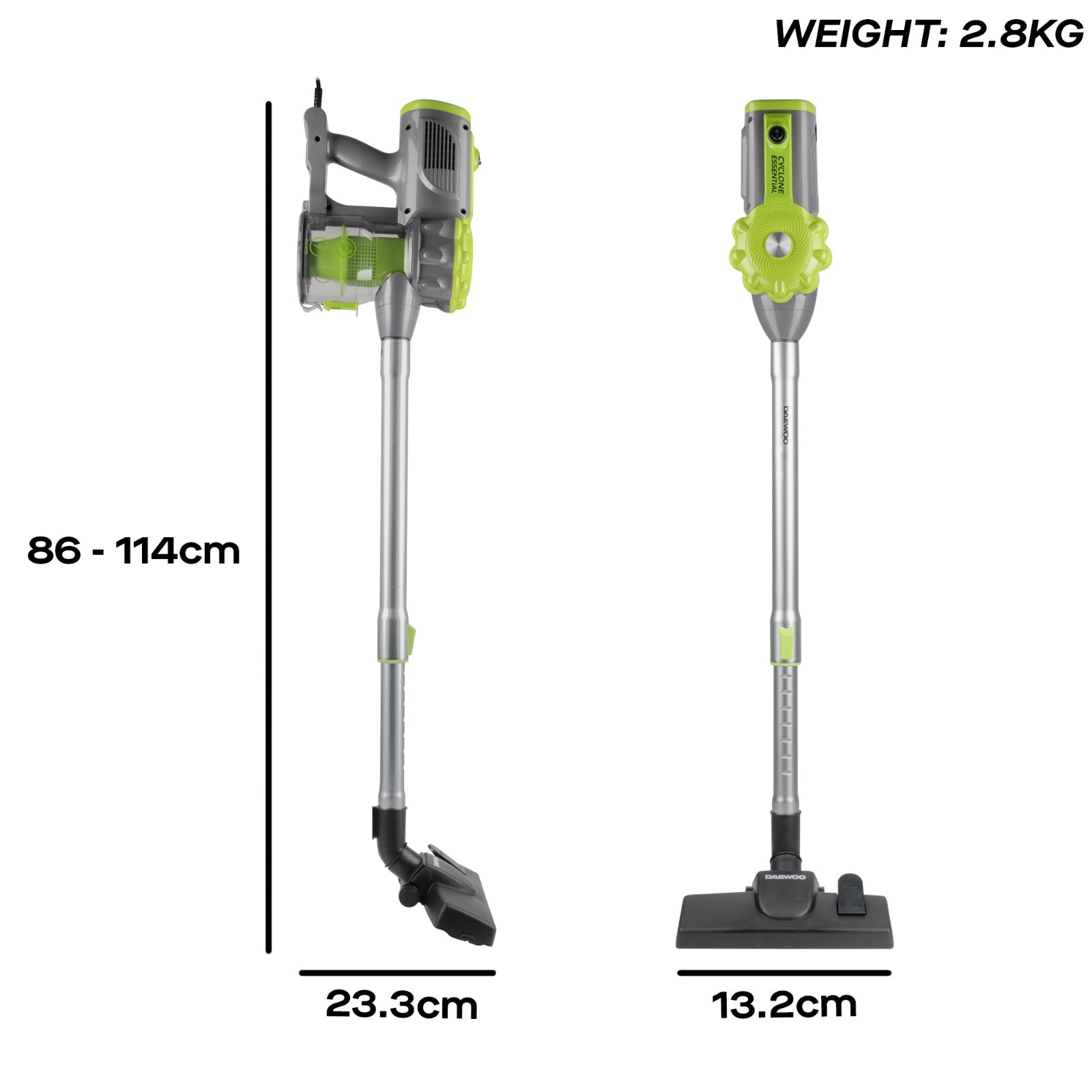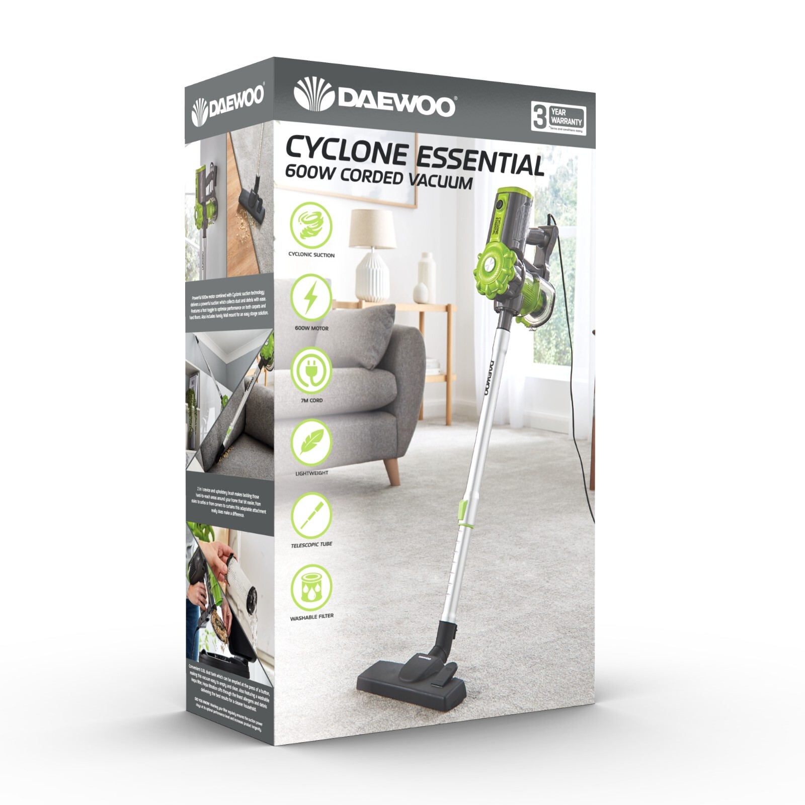 Powerful Cleaning, Effortless Experience - Discover the Daewoo Cyclone Essential Vacuum Cleaner. Its powerful 600W motor, paired with advanced cyclonic suction technology, ensures that even the most stubborn dirt and debris are effortlessly collected, whether you're tackling carpets or hard floors.