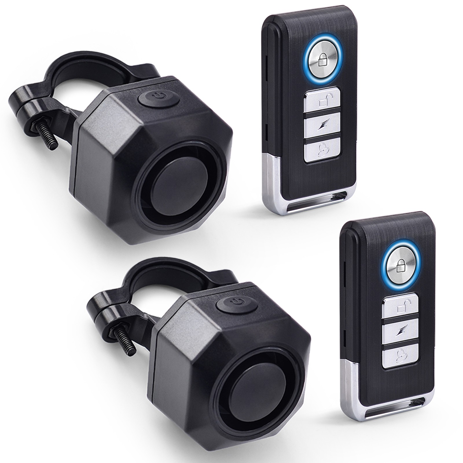 Suitable for Bikes, Electric Bike, Motorcycles,Scooter, Car, Trailer, Luggage, Doors and Windows -USB Rechargeable -Loud alarm & Adjustable Volume,Up to 110dB loud alarm, 3 lever adjustable volume -Vibration alarm, 7 level sensitivity adjustable -IP54 waterproof -Remote control, easy to find your vehicle by 3 kinds of bells -Easy to install & use: Super easy installation by pasting with double-sided sticker or tying it with strap and Bracket -DIY pair Alarm Battery:4.2V 700mAh lithium battery Working Time(Alarm) :1~3 months,standby time 6 months Alarm Charge Port : Standard USB-C 5V Remote Battery : 27A(12V) Alkaline battery Working Time(Remote) :1~2 years(5 times per day) Working Frequency:433.92MHz Working Environment Humidity : <80% Warranty: 2-year.